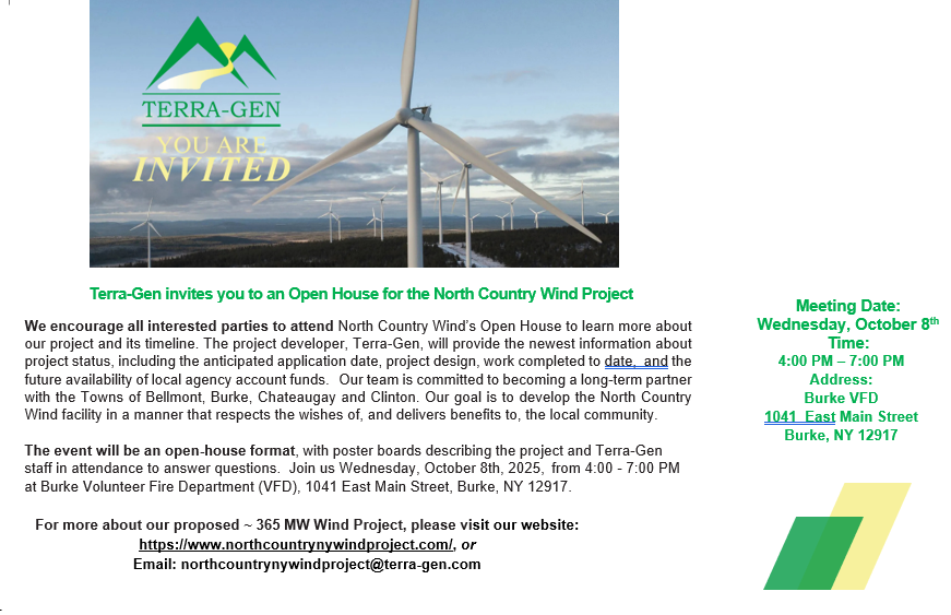 North Country Wind Farm is a large-scale project under development by Terra-Gen in the Towns of Bellmont, Burke, Chateaugay, and Clinton, in Franklin and Clinton Counties, New York. The project is a proposed up to 365 megawatts (MW) wind generating facility that will produce clean, reliable, and locally produced energy.