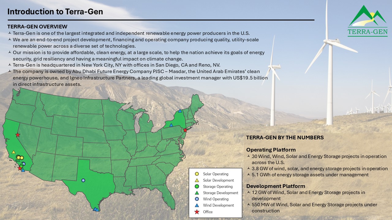 Terra-Gen is a trusted US-based renewable energy developer, owner and operator of projects across throughout the US. Wind energy has been a core part of the US renewables market, is central to New York's clean energy future, and helps support clean air, water and a healthy climate.